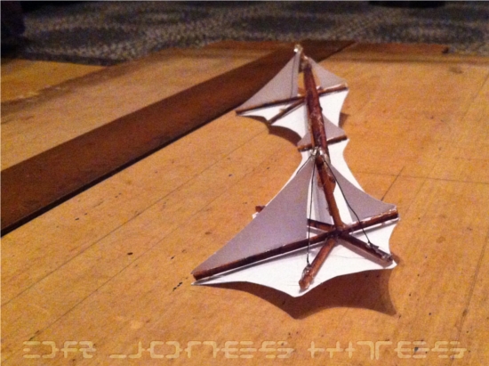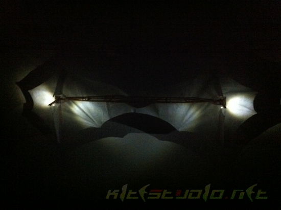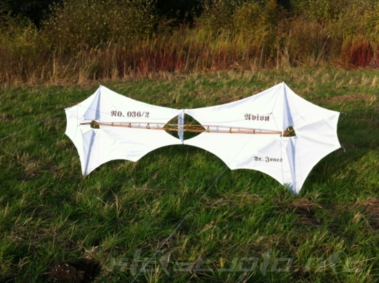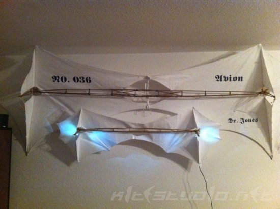Hierbei handelt es sich nicht direkt um einen Kite, wobei das Exponat mit einer Waage sicher auch flugfähig wäre. Die Inspiration dafür stammt von einer guten Freundin, die zu den Bildern des Avion-Prototypen meinte: "...das(!) würde sich gut als Lampe in meinem Wohnzimmer machen!". So langsam reifte dann die Idee eines reinen Deko-Objekts mit Beleuchtung.