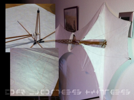 Die Verbinder, die die Mittelspreize mit den restlichen Stäben verbinden, sind Einzelanfertigungen. Ich habe sie absichtlich abnehmbar gestaltet, um den Drachen für den Transport möglichst klein zusammenlegen zu können. Die äußeren Spitzen sind zusätzlich mit Waageschnur abgespannt, um die Belastung auf die Verbinder durch den Winddruck etwas abzufangen.