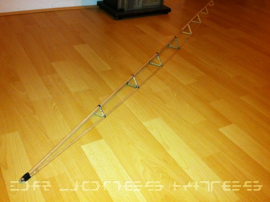 Da das Buchenholz mit 6mm Stärke doch recht biegsam ist und mir eine Mittelspreize um die 2 Meter vorschwebte, mussten drei Stäbe mittels einer Art Fachwerk verbunden werden. Um den Transport einfacher zu gestalten, habe ich die Spreize zweiteilig gestaltet, so daß das Packmaß des Kites etwa bei 105 cm liegt. Das Fachwerk (Zwischenstücke und Diagonalverstrebungen) besteht ebenfalls aus Holz und wurde mittels Epoxydharz dauerhaft verbunden. Die so entstandene Spreize ist sehr steif und über die gesamte Länge recht druckresistent.